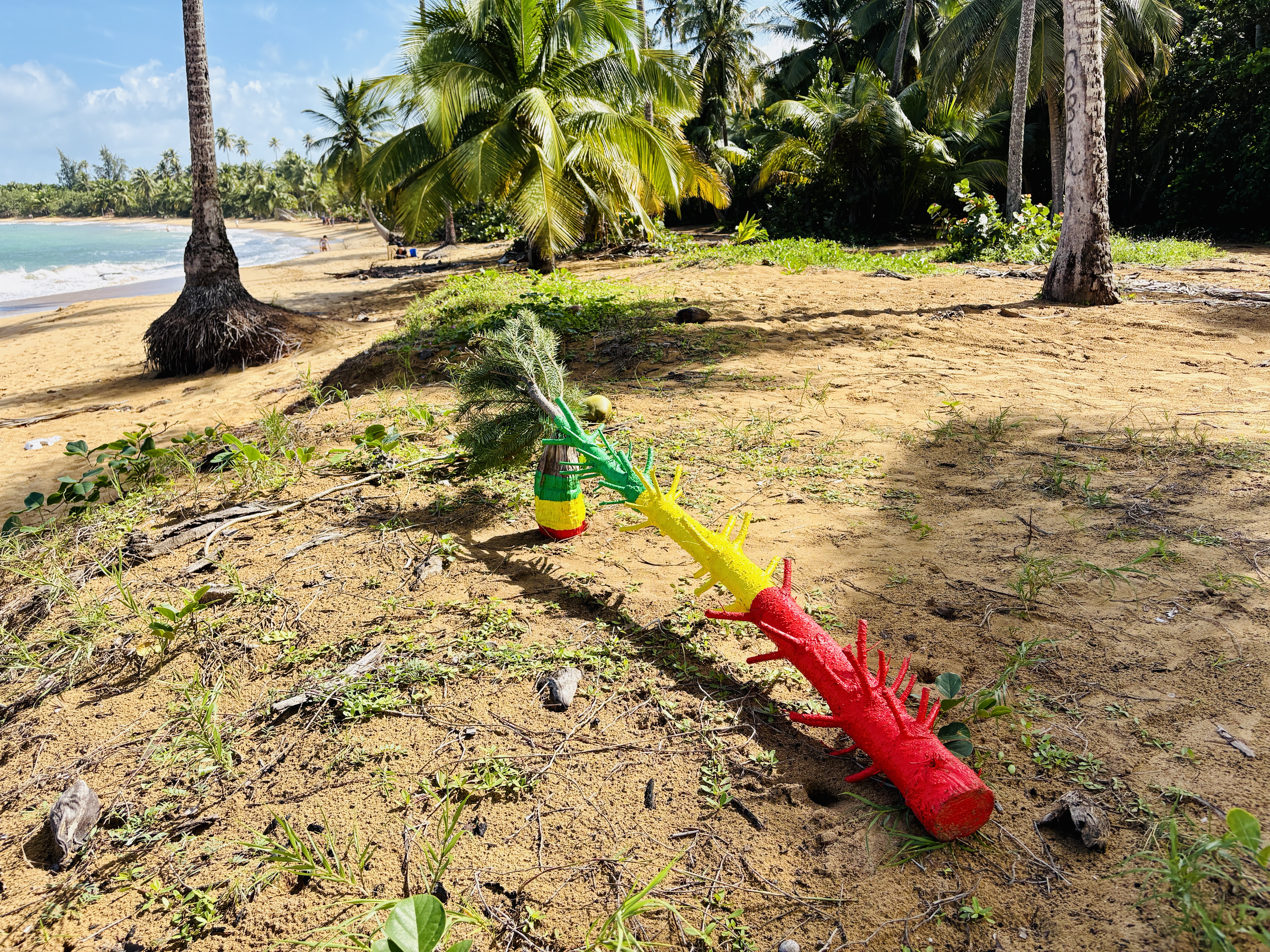 Our work "Ofrenda" (Offering) was presented as part of the event's main exhibition along the coastline. Derived from our long-standing focus on the phenomenon of public painting in Puerto Rico and its link to geometric abstraction, this work embodies a dialogue between the local and foreign through two objects that stand as symbols of economic trade between the global north and south: the coconut and the fir tree.